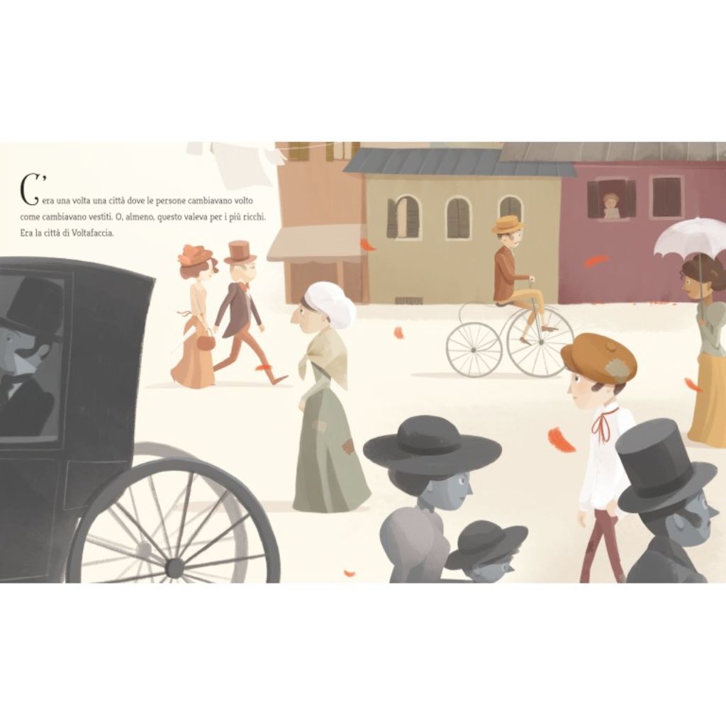 La storia è ambientata nella città immaginaria di Voltafaccia, dove i più ricchi possono cambiarsi il volto come se fosse un abito. In questa realtà sospesa, emergono domande profonde: cosa succede se la bellezza diventa un accessorio? Il racconto sviluppa una profonda riflessione sulla vera natura della bellezza e sull’importanza dell’amore, della poesia e della gentilezza. Il messaggio è chiaro: la vera bellezza vive nel cuore di chi guarda, non nella superficie delle apparenze.