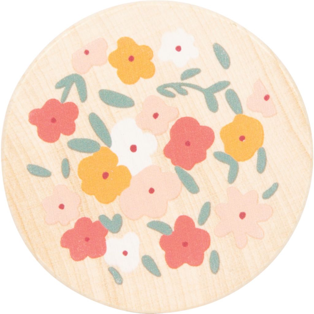 - con perline di vetro che scorrono attraverso le sei piastre perforate colorate a forma di fiori