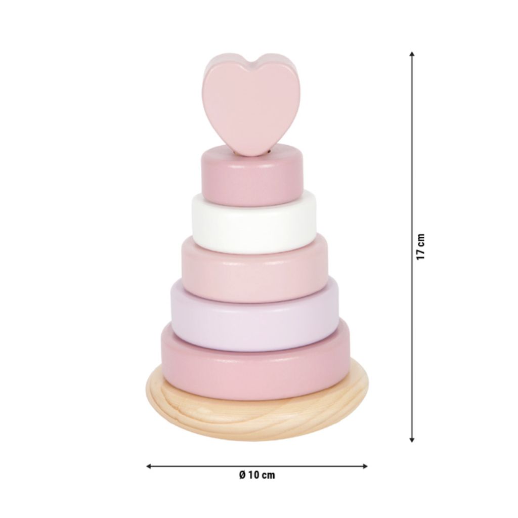 Questa torre da impilare in legno, in delicati toni del rosa e del bianco, stimola la coordinazione occhio-mano, il riconoscimento delle dimensioni e la motricità fine dei più piccoli. I sei anelli colorati, leggeri e facili da afferrare, possono essere disposti uno sopra l’altro in ordine di grandezza – un’attività educativa e divertente allo stesso tempo!