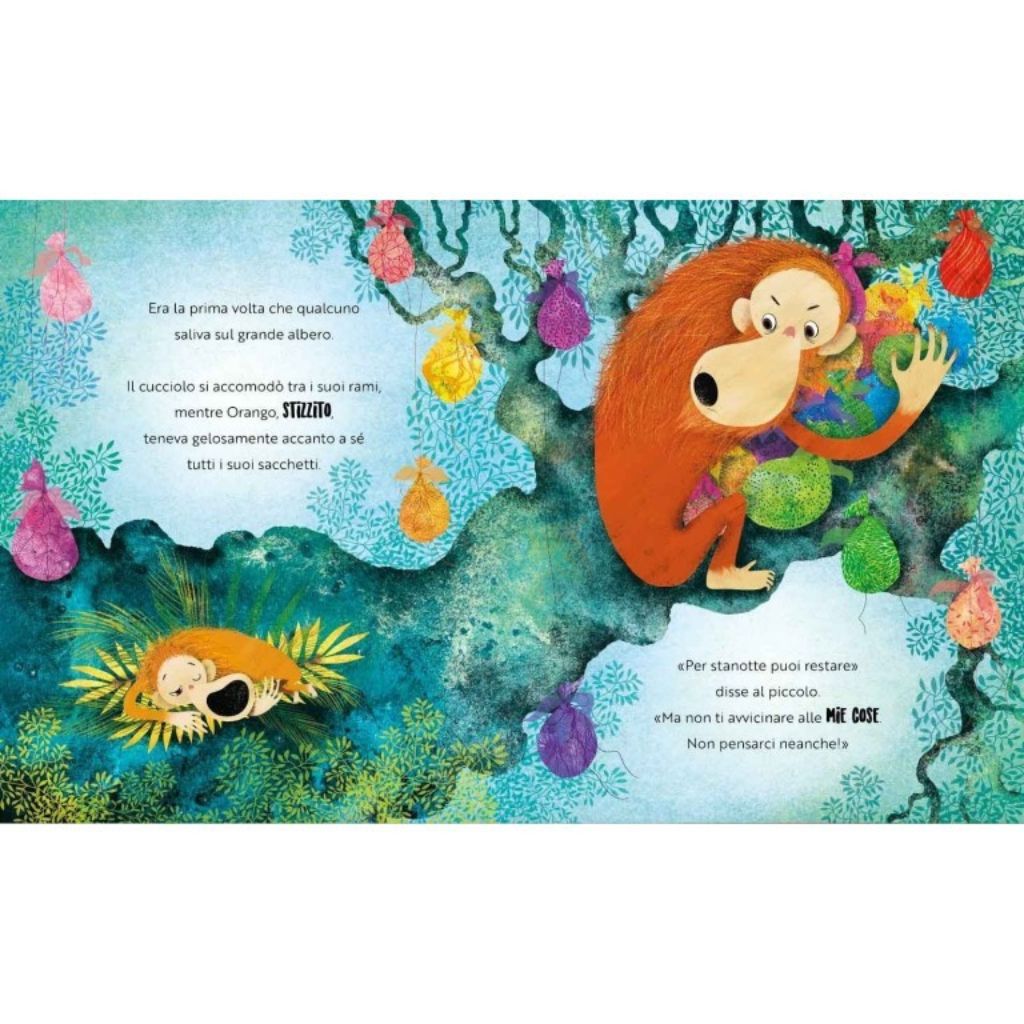 Orango è gelosissimo delle sue cose e non lascia mai che nessuno le tocchi. Ma grazie all’amicizia scopre che condividere è un regalo ancora più bello.